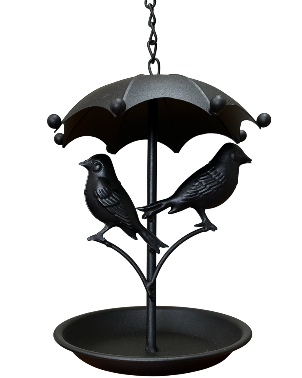 Absolutely adorable and unique design; steel construction umbrella-hanging outdoor bird feeder with top chain, as big hook, and two bird ornaments. With umbrella canopy, the bird seed is kept dry, and the birds are shielded from the sun and rain. It is simple to fill the open tray feeding port with new seed thanks to the circular perch, and the edge provides a perch that allows the birds to eat from any angle. Hang this charming decorative bird feeder on your patio, deck, or garden to give any area some new personality. An adorable antique item for garden décor and a terrific gift for a friend who enjoys gardening. This product is not rust resistant.