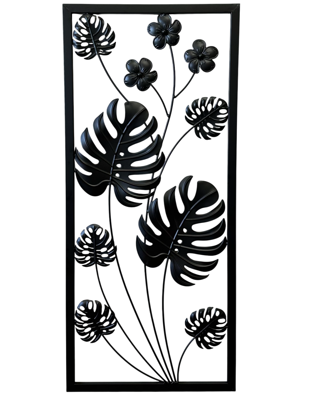 Elevate your space with this striking rectangular wall décor featuring 3D palm leaves crafted from durable black metal. The textured, layered design adds depth and dimension, creating a bold statement piece for any modern interior. Perfect for living rooms, bedrooms, or offices, it combines contemporary style with natural inspiration. This product is not rust resistant.